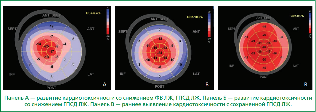 Заключение. Обнаружение типичных изменений локальной продольной систолической деформации ЛЖ необходимо расценивать как ранний признак кардиотоксичности с последующим изменением лечебной тактики: временной или постоянной отмены химиопрепарата, ставшего причиной развития сердечно-сосудистых осложнений, назначение кардиопротективной терапии иАПФ, β-адреноблокаторами и миокардиальным цитопротектором.
