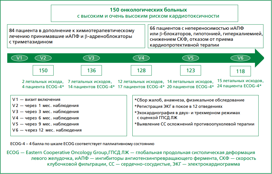 Материал и методы. В проспективное обсервационное исследование на кафедре госпитальной терапии №1 ФГБОУ ВО «Российский университет медицины» Минздрава России в 2021-2023 гг. было включено 150 пациентов с верифицированным онкологическим диагнозом и с очень высоким и высоким риском кардиотоксичности, определенным по шкале клиники Мауо. Всем включенным в исследование пациентам за 5-7 дней до начала химио-таргетной терапии был рекомендован прием фиксированной комбинации ингибитора ангиотензинпревращающего фермента (иАПФ) периндоприла и β-адреноблокатора бисопролола (5+5 мг), а пациентам очень высокого риска кардиотоксичности, у которых была выявлена хроническая сердечная недостаточность (ХСН) ишемического генеза или стабильная ишемическая болезнь сердца, либо постинфарктный кардиосклероз, дополнительно был рекомендован прием триметазидина ОД с пролонгированным высвобождением в дозе 80 мг 1 раз в сутки. На втором визите были сформированы основная группа (n=84, получающие кардиопротективные препараты) и группа сравнения (n=66, не принимающие кардиопротективные препараты). Всем пациентам при включении в исследование, а также через 1, 3, 6, 9 и 12 мес. после начала противоопухолевой терапии, помимо сбора жалоб, данных анамнеза, физикального обследования, регистрации электрокардиограммы в 12 стандартных отведениях проводилась двухмерная эхокардиография с определением глобальной продольной систолической деформации (ГПСД) левого желудочка (ЛЖ).
