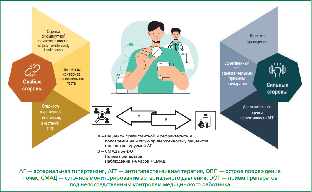 При переносе этой методики в гипертензиологию она была усложнена одновременным выполнением суточного мониторирования АД (СМАД) и/или продолжительным медицинским наблюдением после приема АГП. Тем самым, DOT относится не только к определению факта приверженности к АГТ, но и к методам оценки ее эффективности, что выгодно отличает его от других непрямых и прямых вариантов оценки приверженности (рис. 1).