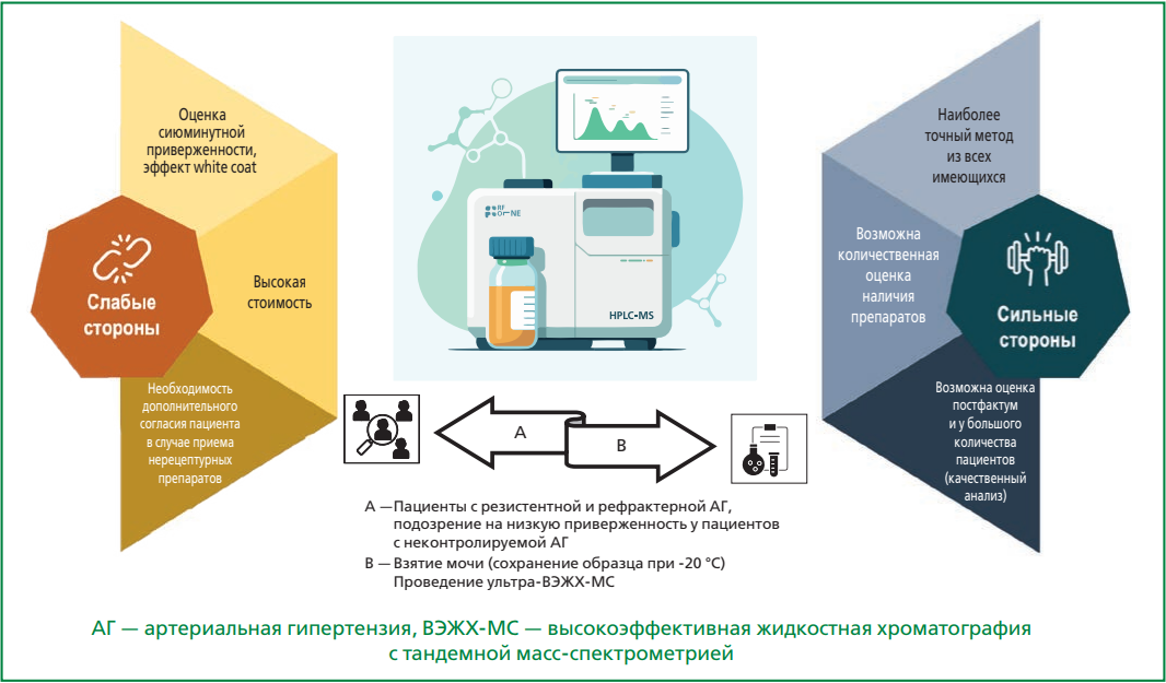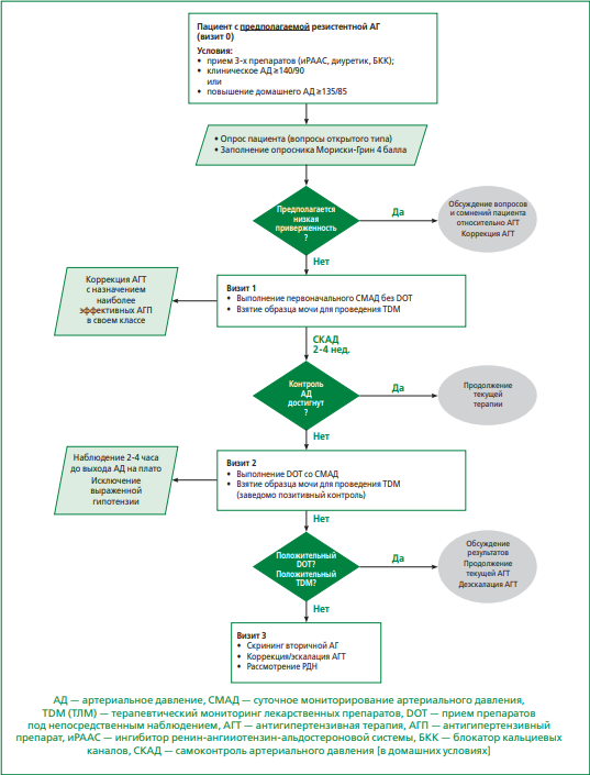 Низкая приверженность к терапии – одна из основных причин псевдорезистентной артериальной гипертензии (АГ), сопряжена с повышением риска сердечно-сосудистых осложнений и увеличением прямых и непрямых медицинских затрат. Оценка приверженности является важным элементом в ведении пациентов с неконтролируемой АГ, особенно при подозрении на устойчивость к терапии. «Золотого стандарта» оценки приверженности к терапии нет и поэтому, кроме непрямых методов, хотя и простых, но довольно ненадежных, в последнее время все чаще используются прямые способы — контроль приема препаратов в присутствии медперсонала, которые проводятся на фоне повторного мониторирования артериального давления при помощи портативных устройств или повторных его измерений специалистом, а также терапевтический мониторинг лекарственных препаратов или метаболитов в биологических жидкостях с использованием ультра-высокоэффективной жидкостной хроматографии с тандемной масс-спектрометрией. В данном описательном обзоре представлены ключевые результаты исследований по применению этих методов, рассмотрены их ограничения и преимущества, а также даны практические рекомендации по внедрению этих подходов в повседневную клиническую практику. Симультанное и как можно более раннее их применение позволяет исключить в ряде случаев необходимость в дополнительных сложных и затратных лечебно-диагностических процедурах, а также более точно и надежно выделить группу пациентов с истинно резистентной АГ — когорту, которая представляет наибольший научно-практический интерес. Использование рассмотренных подходов повышает клинико-экономическую эффективность лечения, помогает выявить парамедицинские проблемы и укрепляет взаимодействие между врачом и пациентом.