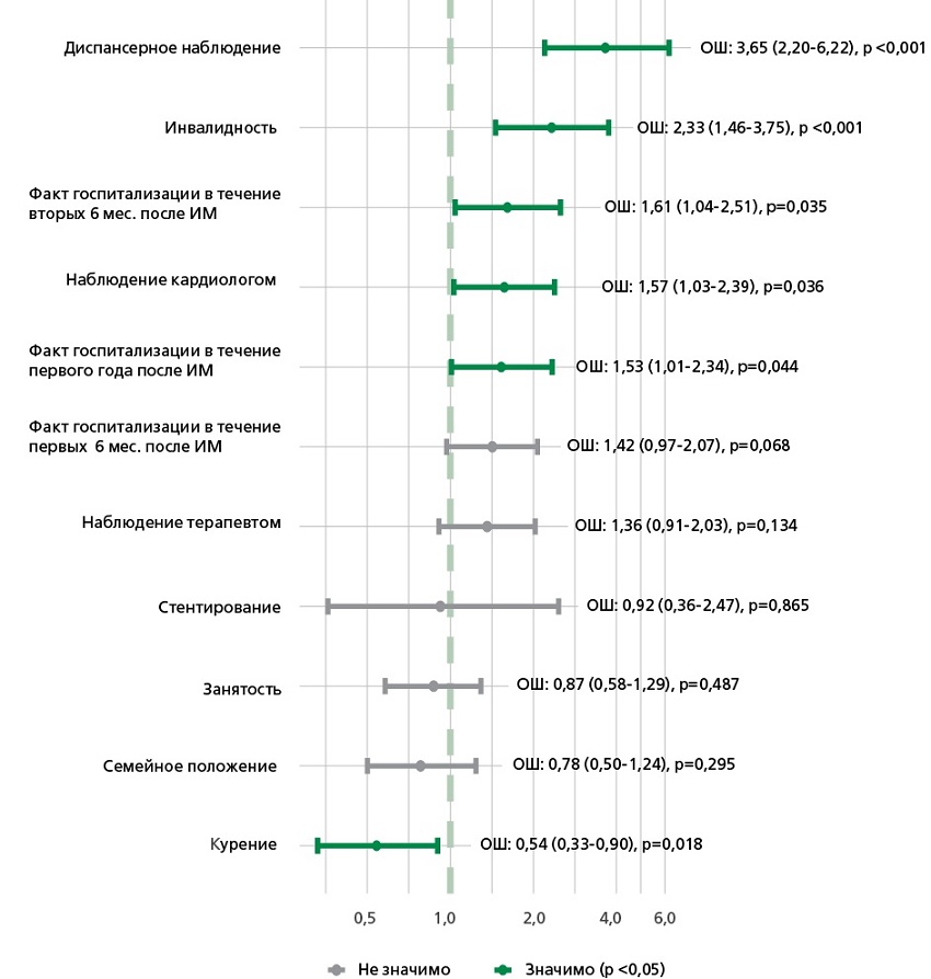 Факторами, статистически значимо ассоциированными с получением ЛЛО на этапе 12 мес. наблюдения, оказались контакты с системой здравоохранения: наблюдение терапевтом (отношение шансов (ОШ) 1,53; доверительный интервал (ДИ): 1,01-2,34; p=0,044), наблюдение кардиологом (ОШ 1,61; ДИ: 1,04-2,51; p=0,035), диспансерное наблюдение (ОШ 3,56; ДИ: 2,2-6,22; p<0,001), повторная госпитализация (ОШ 1,57; ДИ: 1,03-2,39; p=0,036). Единственным фактором, статистически значимо ассоциированным со снижением вероятности получения ЛЛО, оказалось курение (ОШ 0,54; ДИ: 0,33-0,9; p=0,018) (рис. 2).