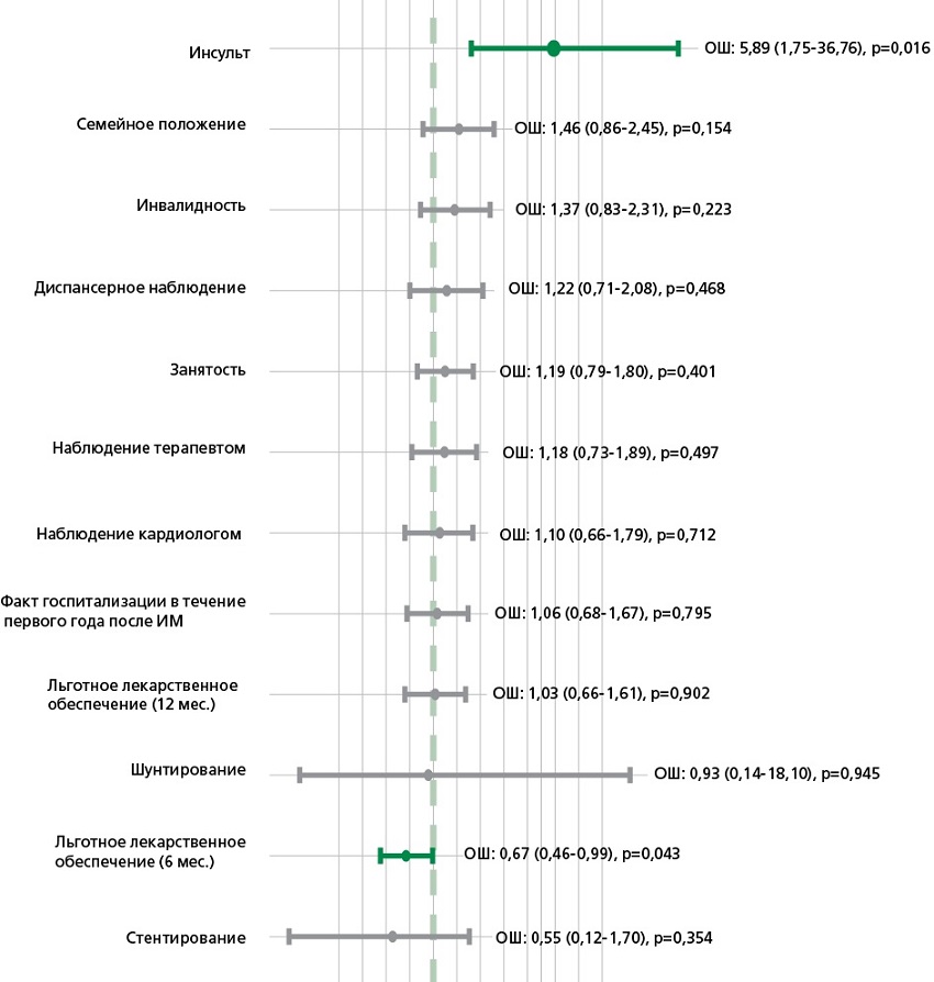 Среди факторов, статистически значимо ассоциированных с высокой приверженностью лечению через 12 мес. после ИМ, можно выделить наличие инсульта в анамнезе (ОШ 5,89; ДИ: 1,75-36,76; p=0,016) (рис. 3). Получение же ЛЛО в первые 6 мес. статистически значимо ассоциировалось с неприверженностью лечению (ОШ 0,67; ДИ: 0,46-0,99; p=0,043), получение ЛЛО на протяжении года после ИМ статистически значимо не влияло на приверженность (ОШ 1,03; ДИ: 0,66-1,61; p=0,902) (рис. 3).