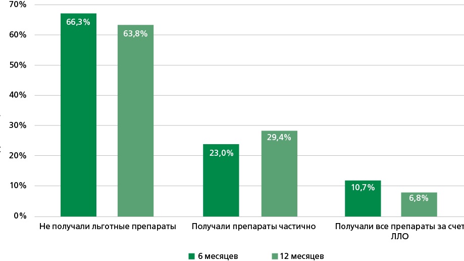 Полностью лекарственные препараты за счет ЛЛО через 6 мес. получали 10,7%, а через 12 мес. 6,5% пациентов. Через год наблюдается перераспределение групп в пользу пула пациентов, получавших льготные препараты частично (с 23,0% через 6 мес. до 29,4% через 12 мес.), с небольшим сокращением числа пациентов, которые не получали ЛЛО (с 66,3% через 6 мес. до 63,8% через 12 мес.) и которые получали все препараты за счет ЛЛО (с 10,7% до 6,8%) (рис. 1). Статистически значимо чаще льготные препараты получали лица старшей возрастной группы (44,9% в группе 65-74 лет и 19,5% в группе 35-44 года, р<0,001). Кроме того, женщины чаще получают ЛЛО по сравнению с мужчинами (45,5% и 33,6%, р=0,006) (табл. 2).