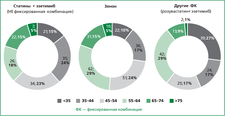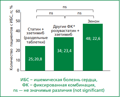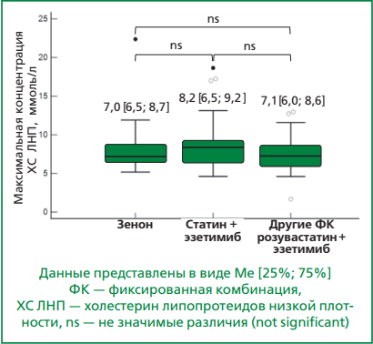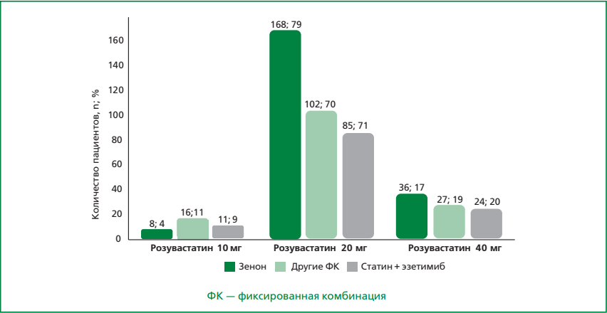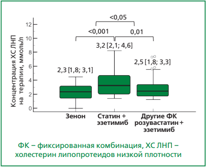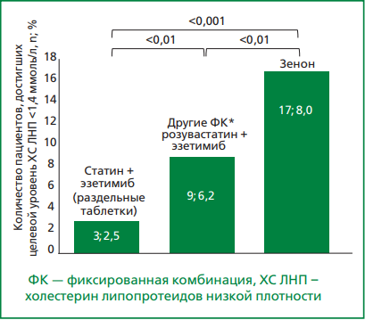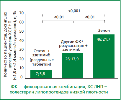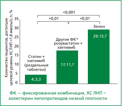Комбинированная ГЛТ с использованием статинов и эзетимиба, является одной из наиболее предпочтительных и рекомендованных стратегий достижения целевых значений ХС ЛНП [2]. В РФ в повседневной практике достаточно распространено применение фиксированной комбинации (ФК) розувастатина и эзетимиба, в частности, препарата Зенон®.