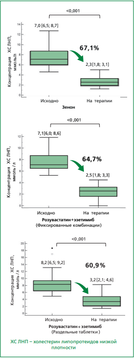 Терапия розувастатином в сочетании с эзетимибом обеспечивала статистически значимое снижение исходного уровня ХС ЛНП: на 61% в группе, получавшей препараты раздельно, на 65% — при применении ФК, и наибольшее снижение — на 67,1% — наблюдалось в подгруппе, принимавшей препарат Зенон® (p <0,001) (рис. 9).
