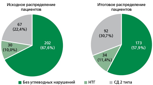Согласно итоговым данным, у 173 (57,9%) человек исследуемой когорты углеводных нарушений не было, у 34 (11,4%) пациентов имелся предиабет и у 92 (30,7%) — СД-2.